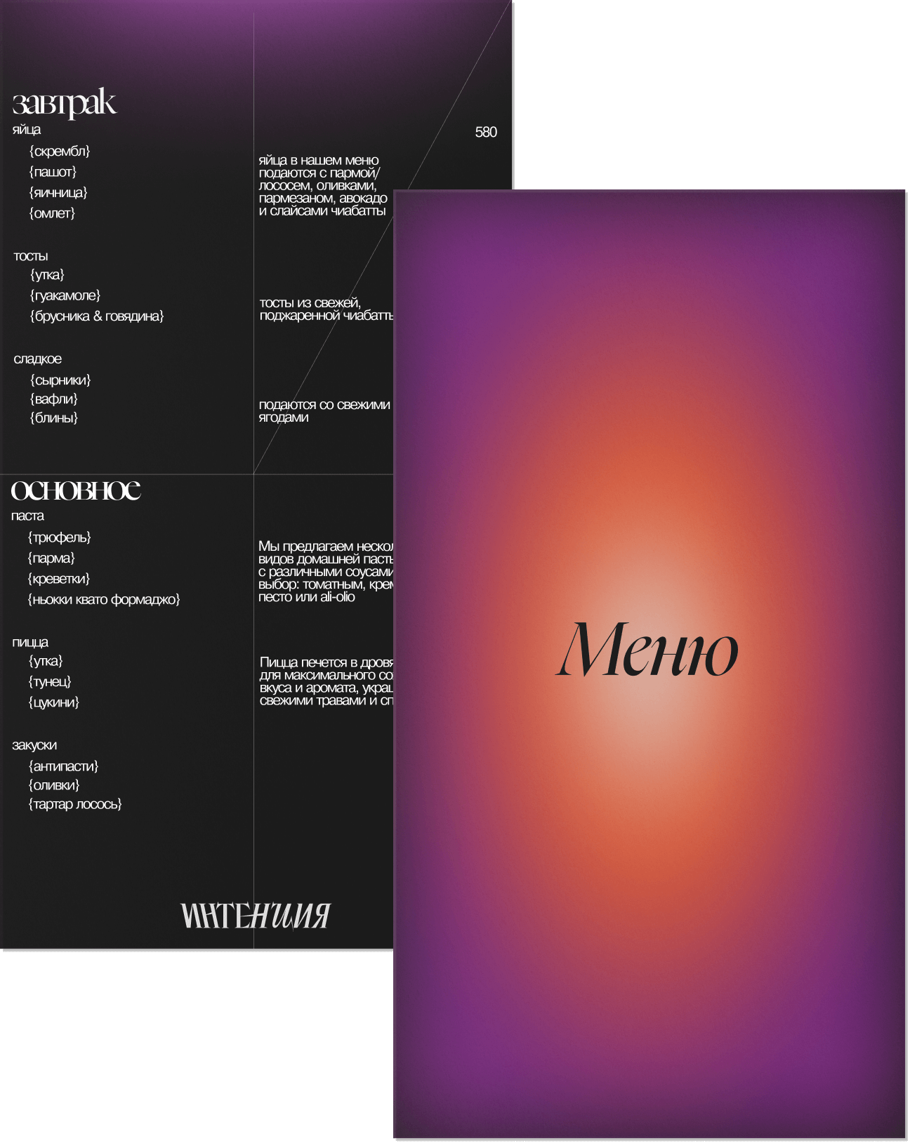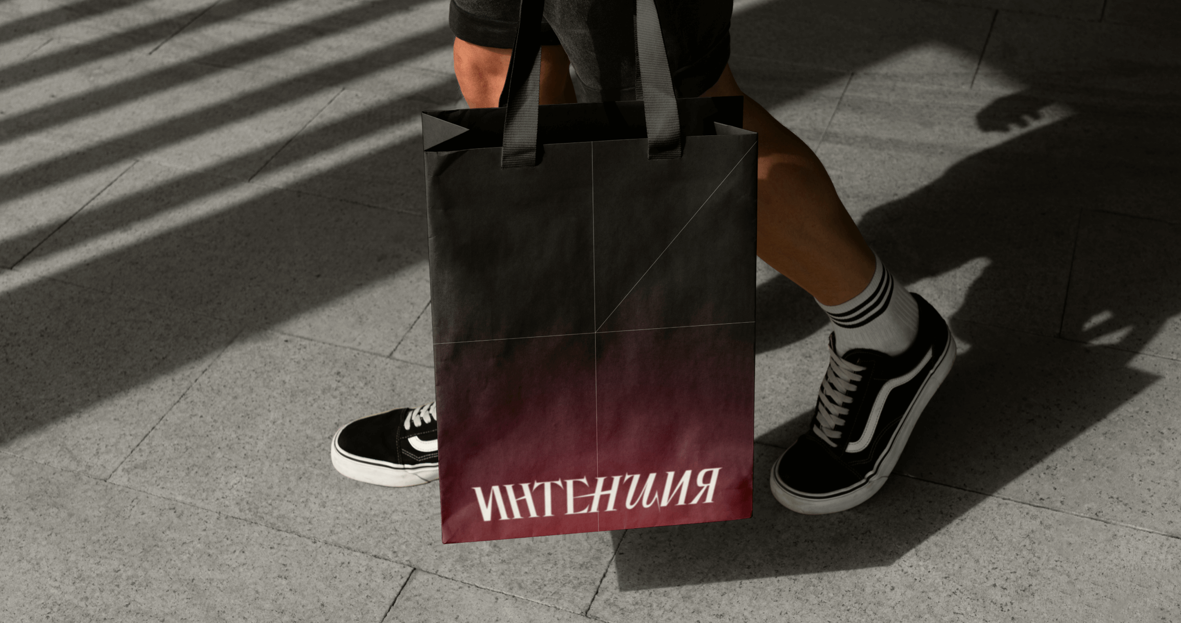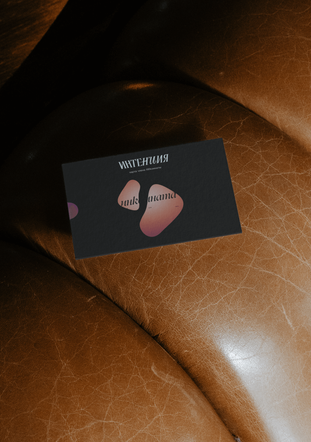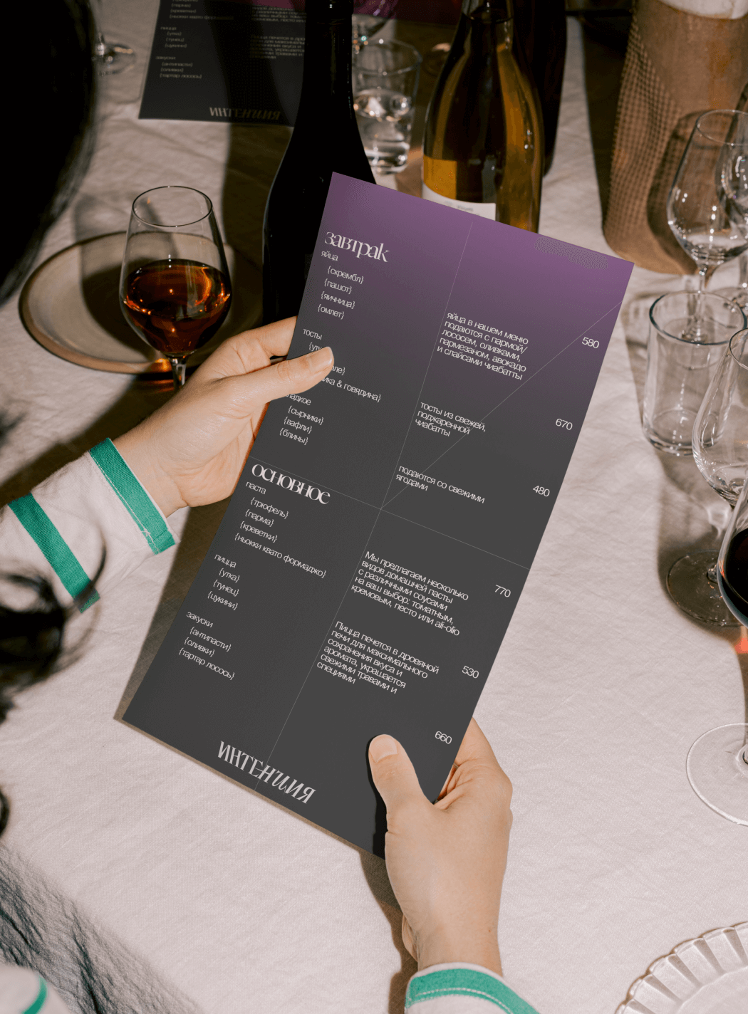 В айдентике было важно выразить характер бренда: ресторан Интенция — это любовник и творец. Наша миссия — нести любовь и восхищение узкому кругу людей, для нас важно, чтобы любили и уважали нас, а мы будем восхищаться нашими гостями в ответ.